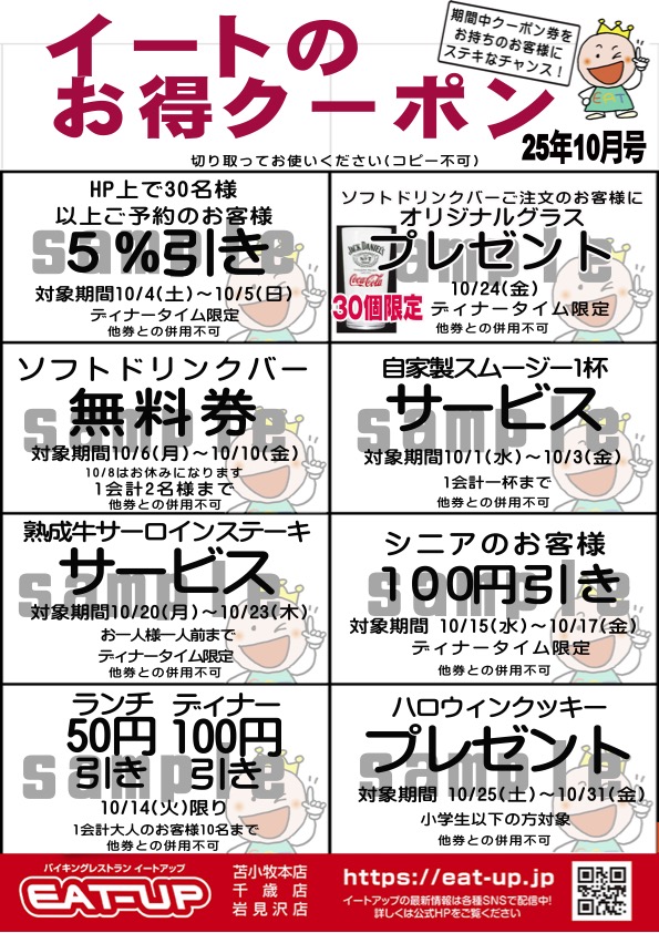 イートのお得クーポンのお知らせ 期間限定 期間限定 2025.09.02 ただいまイートアップでは10月に使えるお得なクーポンを配布中! ソフトドリンクバー無料、HPからのご予約で5%引きなどもりだくさん。 ご来店お待ちしています。